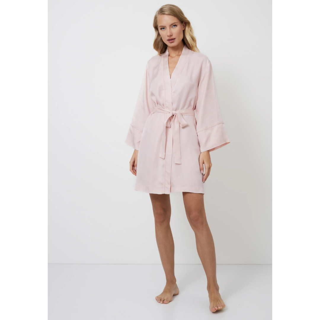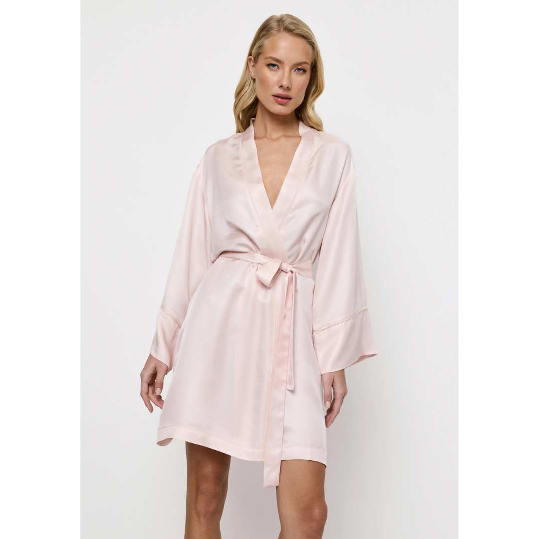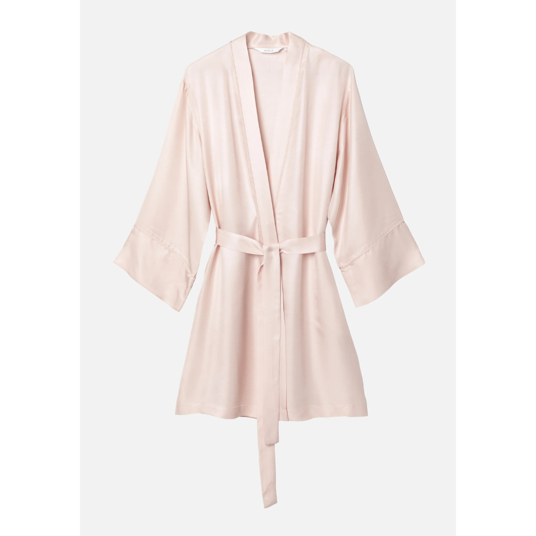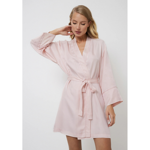 - Finas amarras internas para hacer más cómodo el cruce y amarra satinada para cerrar la bata.