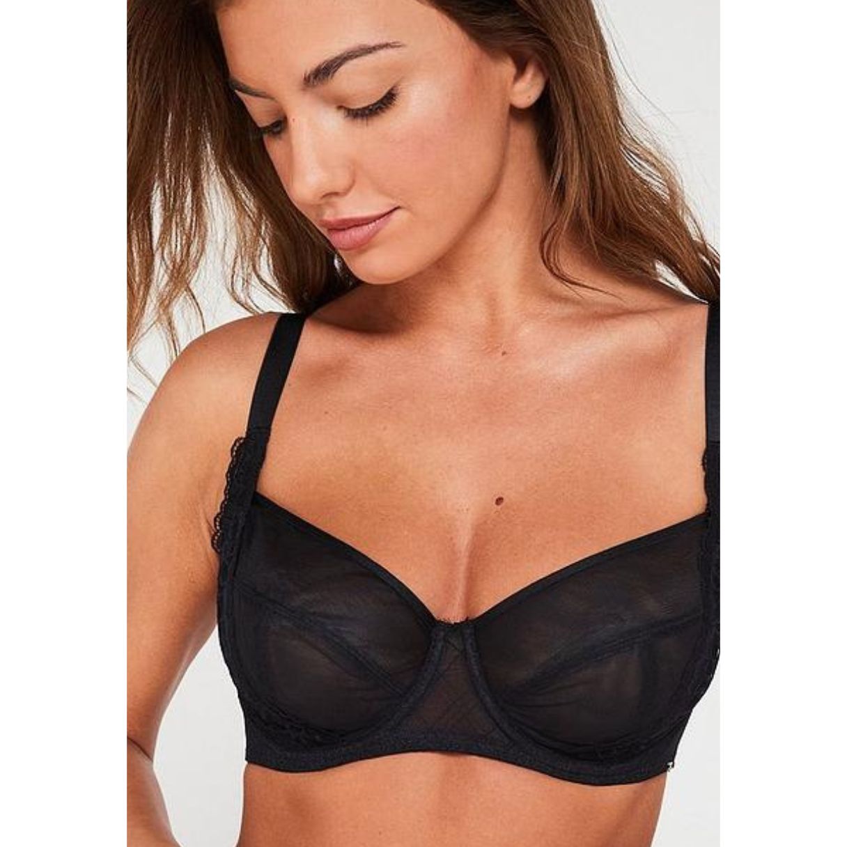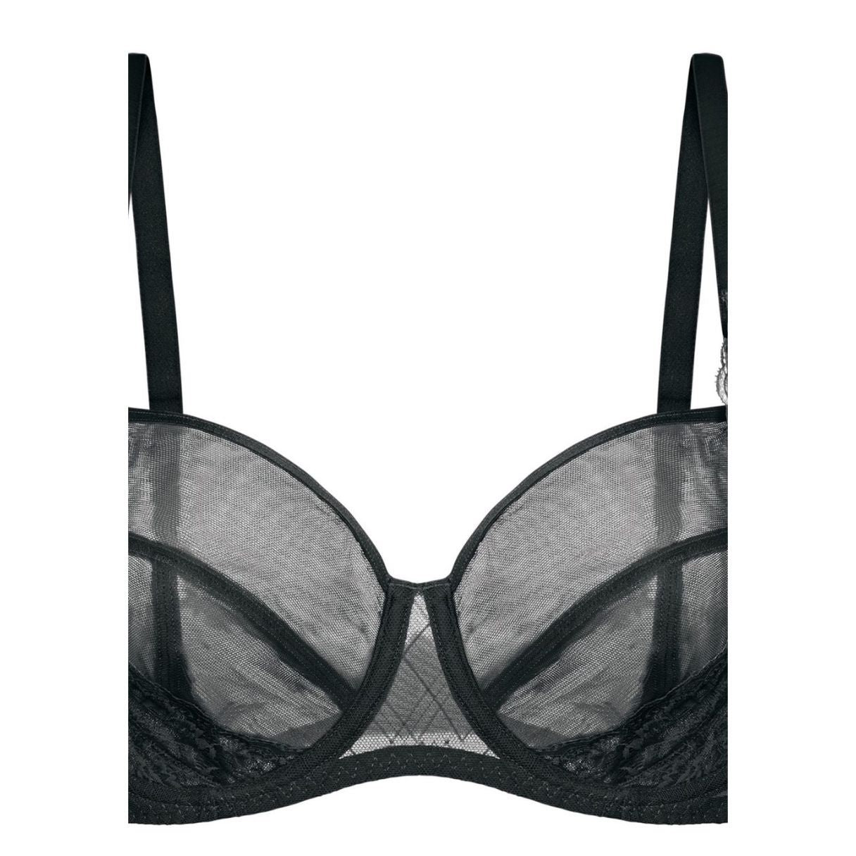 - Copas de malla transparente sin relleno y pieza de encaje floral.