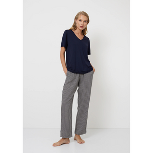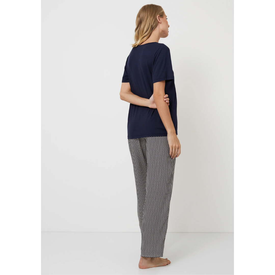 - El pantalón de pijama es de viscosa ligero, con un estampado geométrico en azul y crema.