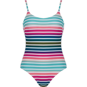 - Traje de baño de una pieza con estampado a rayas multicolor.